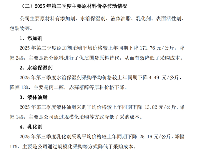 与此同时,丸美生物还通过国货原料替代、规模化采购等方式降低成本。其中,第三季度公司添加剂采购平均价格较上年同期下降171.76元/公斤,降幅24%;液体油脂、乳化剂采购平均价格较上年同期下降13.82元/公斤、25.16元/公斤,降幅14%、11%。
