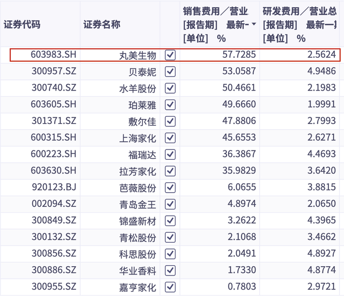 重营销、轻研发,在化妆品行业并不少见。同花顺数据显示,2025年前三季度,A股15家化妆品公司中,丸美生物的销售费用率最高。