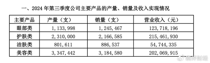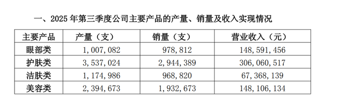 2025年第三季度,丸美生物的眼部类产品销售量97.88万支,同比减少21.4%,产销率也由上年同期的109.8%下降至97.19%。在提价策略下,2025年第三季度,丸美生物的眼部类产品实现营业收入14.86亿元,同比增长20.1%。