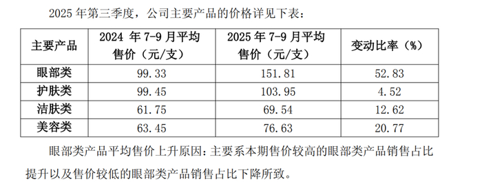 以第三季度为例,丸美生物的产品线中,眼部、护肤、洁肤、美容类产品的平均售价分别为每支151.81元、103.95元、69.54元、76.63元,同比增长52.83%、4.52%、12.62%、20.77%,其中特别是公司“当家花旦”眼部类产品涨价尤为明显。