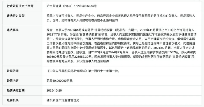 此外,绿谷医药自身还背负着合规污点。就在两个月前,绿谷医药涉嫌在九期一推广中进行商业贿赂,被上海市浦东新区市场监督管理局处罚40万元。