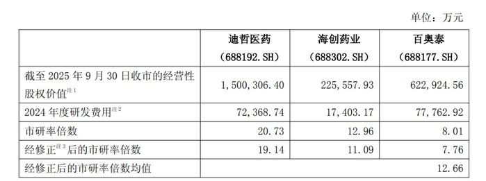 因此,本次估值选取市研率倍数(股权价值/研发费用)作为确定绿谷医药股权价值的分析指标,经修正后的市研率倍数均值为12.66倍。这一定价方法本身,就凸显了本次交易是对绿谷医药研发潜力而非现有资产的定价。