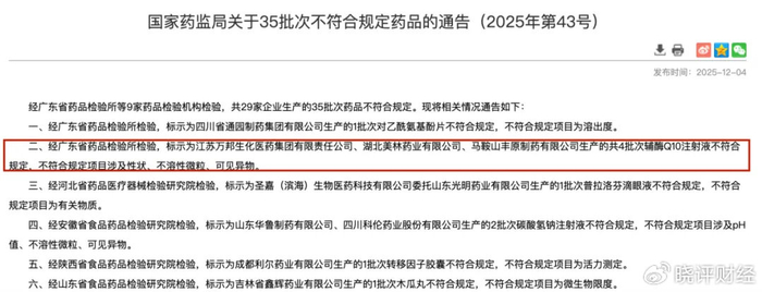 其中,经广东省药品检验所检验,标示为江苏万邦生化医药集团有限责任公司等公司生产的共4批次辅酶Q10注射液不符合规定,不符合规定项目涉及性状、不溶性微粒、可见异物。
