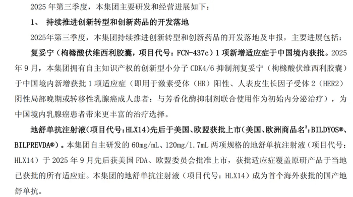 2025年前三季度,复星医药的研发投入共计39.98亿元,同比增长2.12%;其中,研发费用为27.30亿元,同比增长3.08%,主要投入于包括核药、细胞治疗在内的创新平台及HLX22(重组人源化抗 HER2单克隆抗体注射液)、注射用HLX43(靶向 PD-L1抗体偶联药物)等高价值管线的全球多中心临床研究。报告期内,复星的创新药品收入超67亿元,同比增长18.09%。