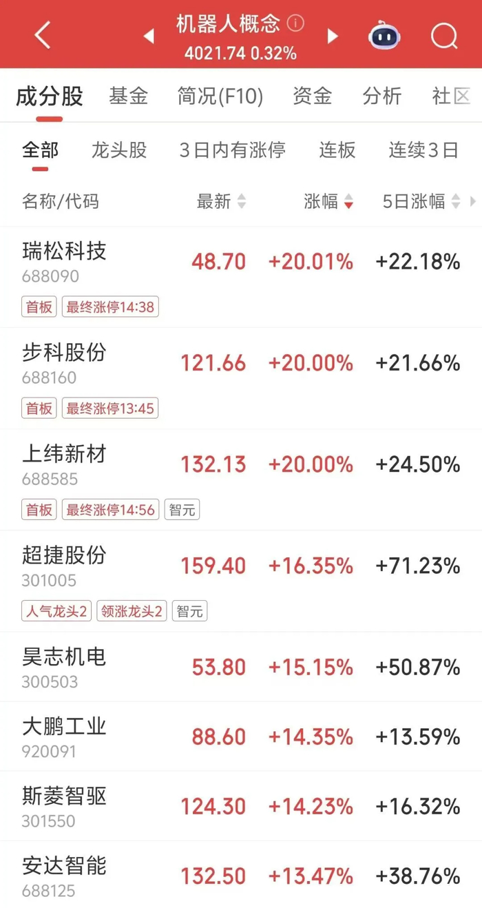 今日午后,机器人概念反复活跃,板块内个股上演涨停潮。上纬新材、步科股份收获“20CM”涨停,双双创历史新高;天奇股份、五洲新春等多股涨停。
