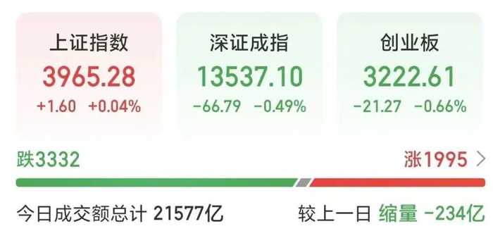 截至收盘,上证指数涨0.04%,深证成指跌0.49%,创业板指跌0.66%。市场全天成交额超2.15万亿元。