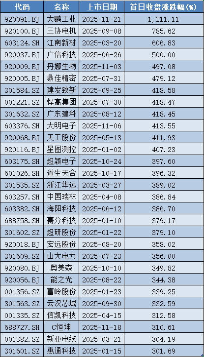 具体来看,今日上市的大鹏工业,以1211.11%的首日收盘涨幅排名第一,也是今年第一只涨幅超过1000%的十倍新股。