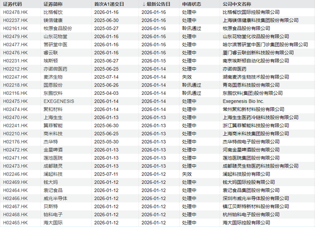 其中,比格餐饮国际控股有限公司、山东花物堂化妆品股份有限公司、哈尔滨誉研堂中医门诊集团股份有限公司、厦门睿云联创新科技股份有限公司、Exegenesis Bio Inc.、常州聚和新材料股份有限公司、上海生生医药冷链科技股份有限公司、河南金星啤酒股份有限公司、莲池医院集团股份有限公司、成都赜灵生物医药科技股份有限公司、钱大妈国际控股有限公司、袁记食品集团股份有限公司、深圳市威兆半导体股份有限公司、镇江贝斯特新材料股份有限公司、杭州铂科电子股份有限公司、海大国际控股有限公司等16家公司为首次递交。