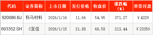 1月16日,科马材料在北交所挂牌上市,发行价为11.66元/股,截至上市首日收盘,该股报54.95元/股,涨幅为371.27%。以收盘价计算,投资者中一签浮盈为4329元。
