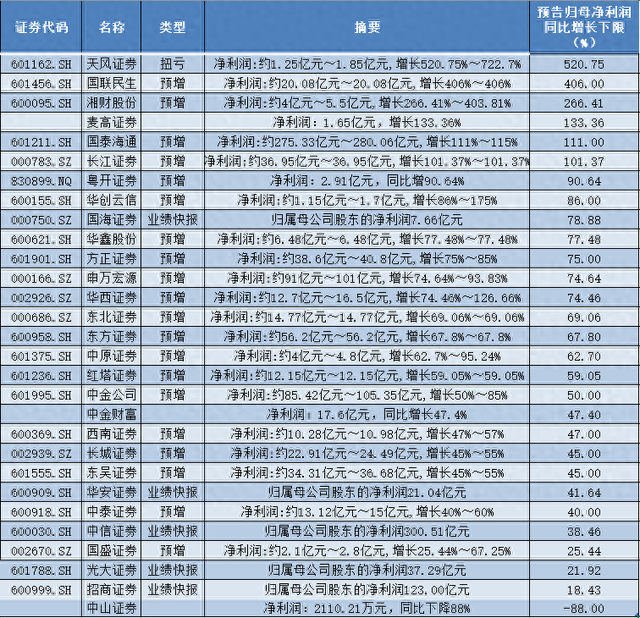 从净利润增幅来看,目前已披露业绩情况的29家券商,有6家券商增幅翻番,19家的增幅下限超过50%。