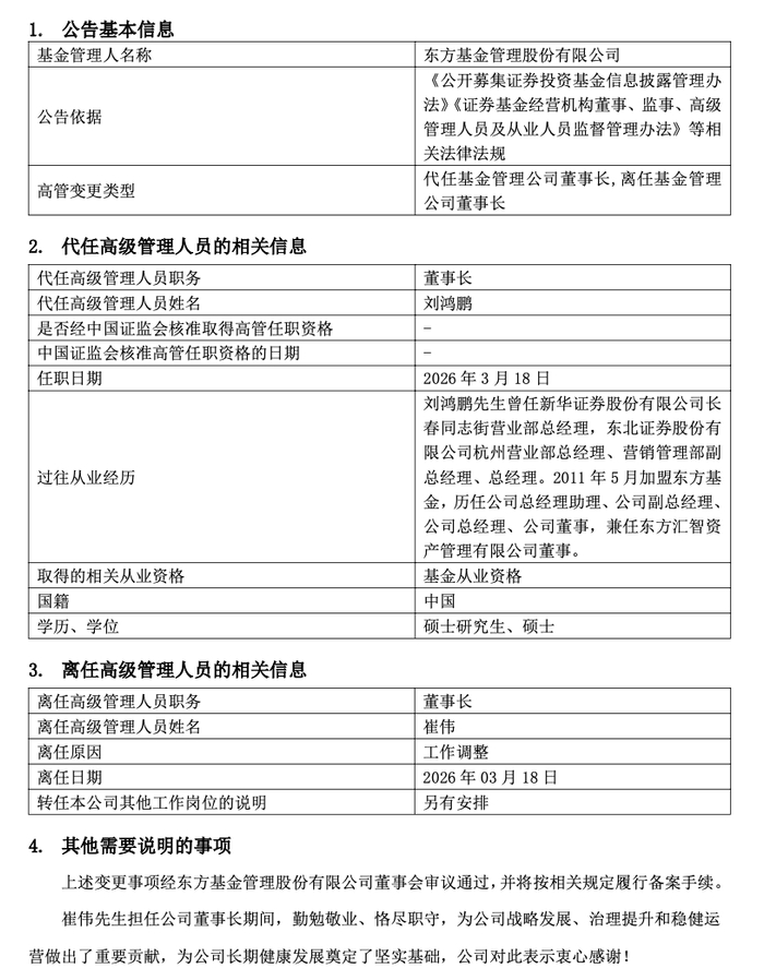 3月20日,东方基金管理股份有限公司(下称“东方基金”)公告称,自3月18日起,因工作调整,崔伟离任公司董事长职务,由公司总经理刘鸿鹏代任董事长。公告中,对于崔伟转任公司其他工作岗位的说明为“另有安排”。
