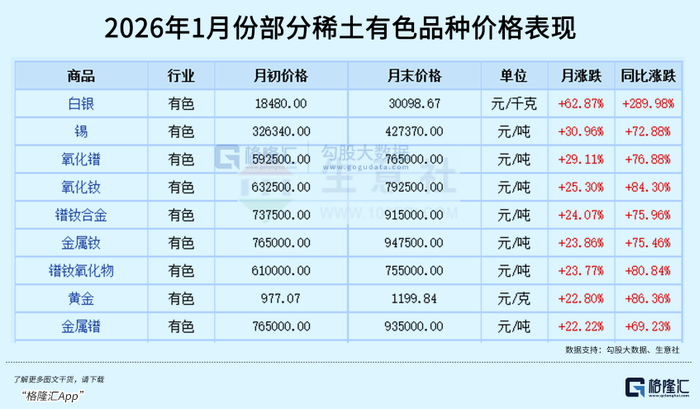 实际上,据生意社行情数据显示,2026年以来,大量稀土有色品种就迎来的强势涨价行情,且多数品种月度环比涨幅超过20%以上,显示涨速在加快。