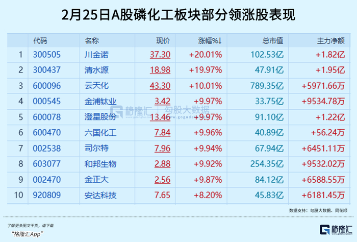 盘中时段,澄星股份强势2连板,川金诺、清水源双双20cm涨停,川发龙蟒、云天化、司尔特封死10cm涨停板,湖北宜化、兴发集团、川恒股份大涨超6%。