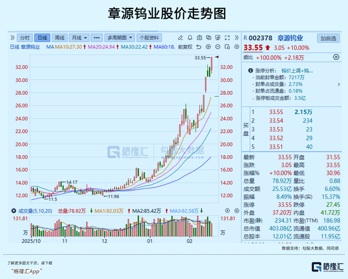 2月24日公布的长单采购价,成为钨板块上涨的直接催化剂。55%黑钨精矿报价73万元/标吨,55%白钨精矿72.9万元/标吨,仲钨酸铵107万元/吨——三项主要产品价格较上半月均明显上调。