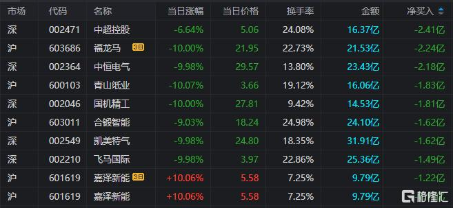 龙虎榜单日净卖出额前三为中超控股、中恒电气、青山纸业,分别为2.41亿元、2.18亿元、1.83亿元。