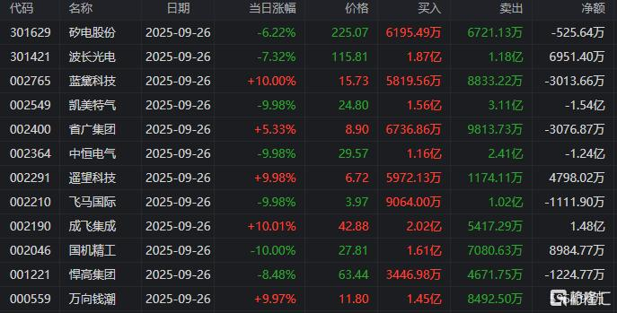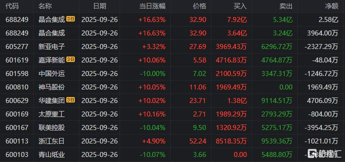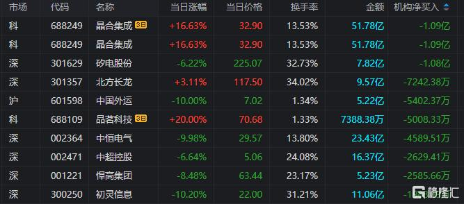 龙虎榜中涉及机构专用席位的个股中,当日净卖出额前三为晶合集成、矽电股份、北方长龙,分别为1.09亿元、1.08亿元、7242.38万元。