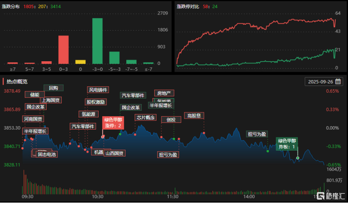 9月26日,沪指跌0.65%,深成指跌1.76%,创业板指跌2.60%。沪深两市成交额2.15万亿,全市场超3400只个股下跌。风电、保险等板块上涨,游戏、算力硬件、光刻机等跌幅居前。