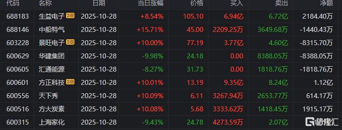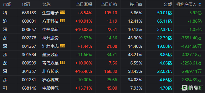 龙虎榜中涉及机构专用席位的个股中,当日净卖出额前三为中钨高新、神开股份、建发致新,分别为1.05亿元、7551.40万元、4027.18万元。