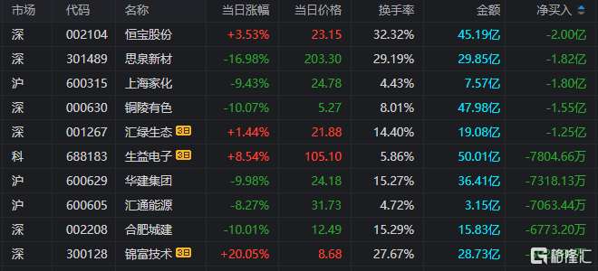 神开股份:今日跌9.57%,换手率45.90%,成交额22.79亿元。龙虎榜数据显示,机构净卖出7551.40万元。