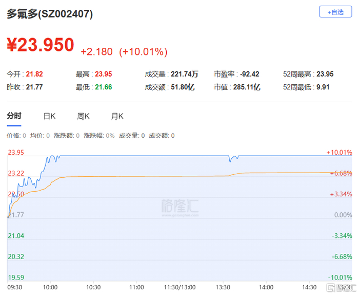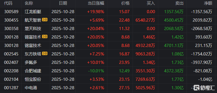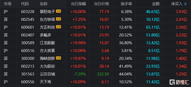 龙虎榜单日净买入额前三为多氟多、江龙船艇、方大炭素,分别为2.22亿元、1.93亿元、1.79亿元。