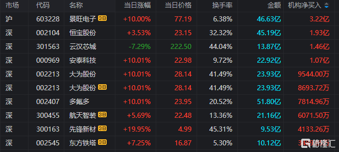 大为股份:今日涨停,换手率41.49%,成交额23.93亿。龙虎榜数据显示,2机构净买入9544万元,欢乐海岸净卖出3244万元。