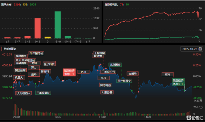 10月28日,沪指4000点得而复失,创业板指冲高回落。全市场成交额2.17万亿元,较前一交易日缩量1913亿元。福建、军工、港口航运等板块上涨,有色金属、风电设备、油气等板块跌幅靠前。