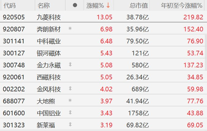 格隆汇10月30日|A股市场稀土永磁概念股集体拉升,其中,九菱科技涨13%,奔朗新材、中科磁业涨超6%,银河磁体、金力永磁、西磁科技涨超5%,