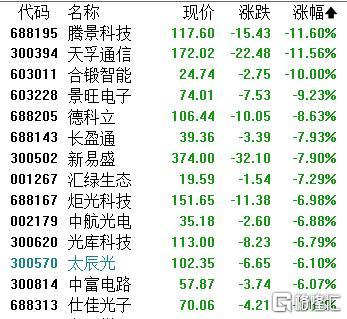 CPO板块回调,腾景科技、天孚通信跌超11%,合锻智能跌停,景旺电子、德科立、长盈通、新易盛、炬光科技、中航光电等跟跌。