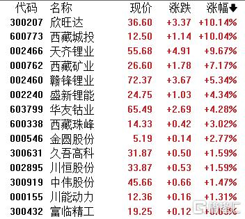 盐湖提锂板块涨幅居前,西藏城投、天齐锂业涨停,西藏矿业、赣锋锂业、盛新锂能等跟涨。