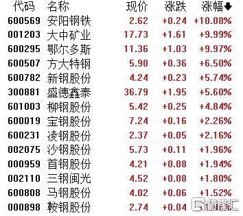 钢铁板块拉升,安阳钢铁、大中矿业、鄂尔多斯涨停,方大特钢、新钢股份、盛德鑫泰、柳钢股份、宝钢股份等跟涨。