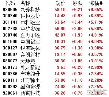 稀土永磁板块午后拉升,九菱科技涨超9%,科恒股份、中科磁业、中矿资源、金力永磁等跟涨。