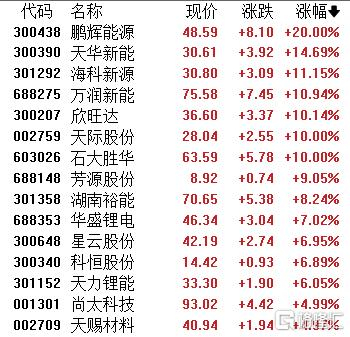 电池板块走高,鹏辉能源20CM涨停,天际股份、石大胜华涨停,天华新能、海科新源、万润新能、欣旺达等跟涨。
