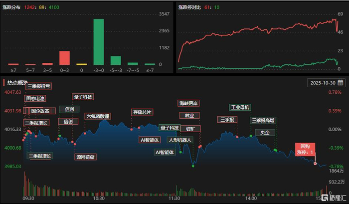 10月30日,A股主要指数主要指数震荡走低,沪指跌0.73%报3986点,深证成指跌1.16%,创业板指跌1.84%。沪深两市成交额2.42万亿,较上一个交易日放量1656亿。