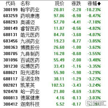 CRO概念低迷,翰宇药业跌超10%,药明康德跌超8%,奥浦迈、睿智医药、皓元医药、九洲药业等跟跌。