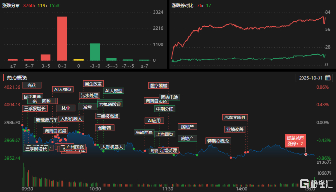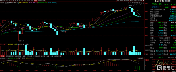 10月31日,A股主要指数集体下跌,截至收盘,沪指跌0.81%报3954点,深证成指跌1.14%,创业板指跌2.31%,科创50指数跌3.13%。全市场成交额2.35万亿元,较前一交易日缩量1145亿元,超3700股上涨,逾1500股下跌。