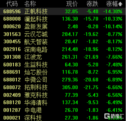 储存芯片板块继续回调,正帆科技跌超14%,澜起科技、盈新发展跌超10%,云汉芯城、航天智装、深南电路跌超8%。