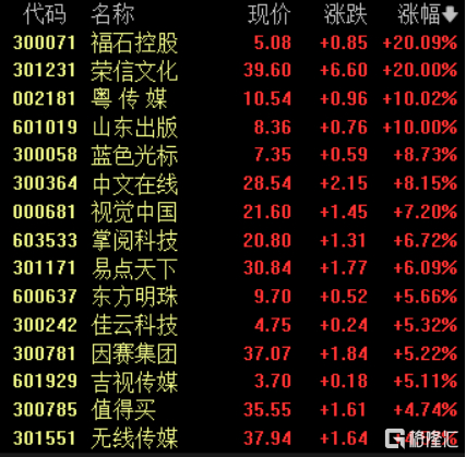 文化传媒板块延续涨势,福石控股、荣信文化20cm涨停,粤传媒、山东出版涨停,蓝色光标涨超8%.