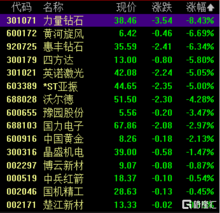 培育钻石板块下跌,力量钻石跌超8%,黄河旋风、惠丰钻石跌超6%,四方达、英诺激光跌超5%。
