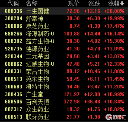 创新药板块上涨,三生国健、舒泰神20cm涨停,众生药业、联环药业等涨停,泽璟制药涨超16%,益方生物涨超15%。