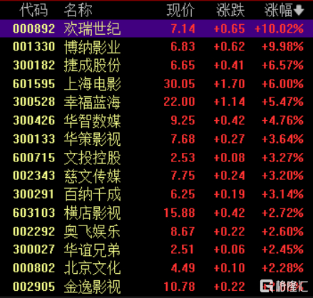 影视院线板块走高,欢瑞世纪、博纳影业涨停,上海电影、捷成股份涨超6%,幸福蓝海涨超5%。