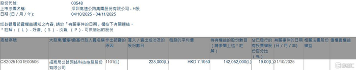 格隆汇11月4日丨根据联交所最新权益披露资料显示,2025年10月31日,深圳高速公路股份(00548.HK)获招商局公路网络科技控股股份有限公司在场内以每股均价7.195港元增持22.8万股,涉资约164.05万港元。