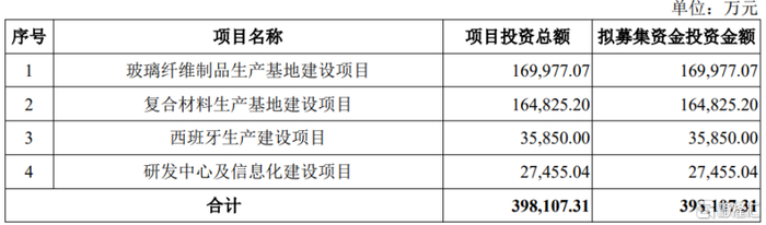 本次IPO,振石股份拟募集资金约39.81亿元,用于玻璃纤维制品生产基地建设项目、复合材料生产基地建设项目、西班牙生产建设项目、研发中心及信息化建设项目。