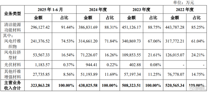 具体来看,2022年至2025年上半年(简称“报告期”),振石股份85%以上的收入主要来自清洁能源功能材料,其中,风电纤维织物的营收占比在60%以上,风电拉挤型材的营收占比在20%左右,光伏材料的营收占比较低。