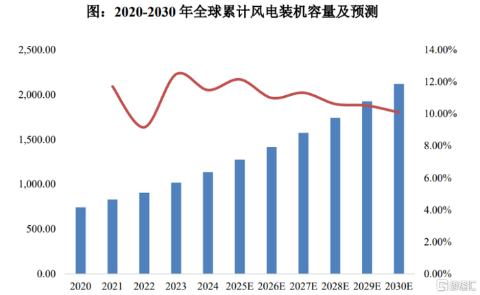 风力发电主要是利用风动能进行转化使其成为机械动能,再把机械动能转换为电能。在全球气候变暖和减少碳排放的背景下,全球风电行业发展很快。据《全球风能报告2024》,2024年全球风电新增装机量达到117GW,2001-2024年全球风电新增装机量年复合增长率达13.39%。