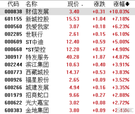 地产股部分活跃,财信发展涨停,新城控股涨超7%,滨江集团、招商蛇口、金地集团跟涨。