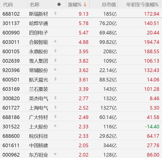格隆汇11月24日|A股市场可控核聚变板块集体上涨,截至半日收盘,斯瑞新材涨超9%,哈焊华通、四创电子涨超5%,合锻智能涨超4%,永鼎股份、雪人集团、常辅股份、航天晨光、兰石重装涨超3%。消息面上,今日上午,在位于安徽合肥未来大科学城的紧凑型聚变能实验装置(BEST)主机大厅,中国科学院“燃烧等离子体”国际科学计划正式启动并面向国际聚变界首次发布BEST研究计划,聚力点燃“人造太阳”。