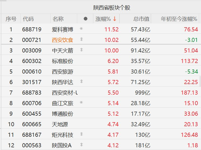 格隆汇11月27日|A股市场陕西股拉升,其中,西安饮食、中天火箭直线封板,西安旅游、陕西华达、曲江文旅、天地源、陕国投A、博通股份、西部证券、派瑞股份、环球印务等跟涨。消息面上,陕西省出台深化资本市场改革助力陕西高质量发展的十六条措施,重点推动主业不突出、经营效益差的国有控股上市公司实施重大资产重组。