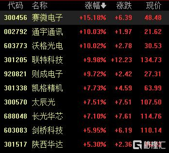 谷歌产业链概念股继续活跃,赛微电子涨超15%,通宇通讯、沃格光电10cm涨停,联特科技涨超9%,太辰光、长光华芯等跟涨。