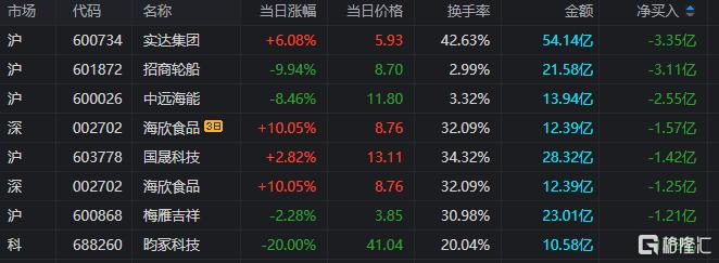 龙虎榜单日净卖出额前三为实达集团、招商轮船、中远海能,分别为3.35亿元、3.11亿元、2.55亿元。