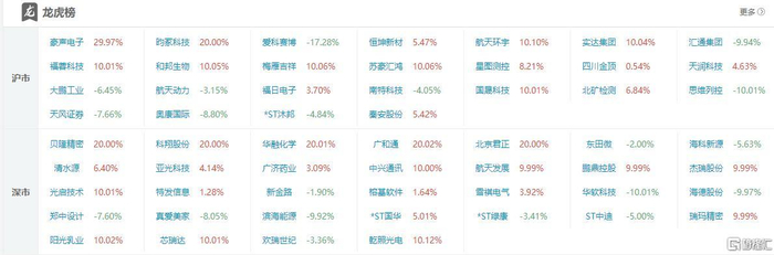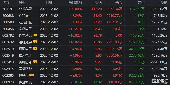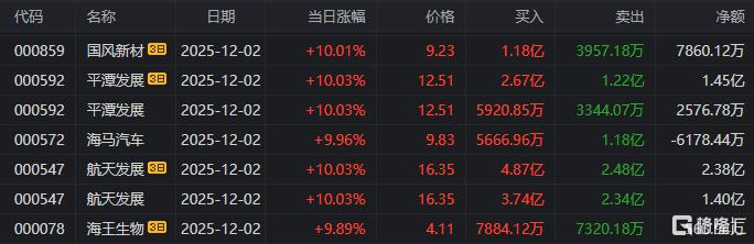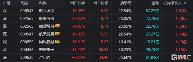 龙虎榜中涉及机构专用席位的个股中,当日净买入额前三为航天发展、顺灏股份、赛微电子,分别为1.67亿元、1.50亿元、1.13亿元。